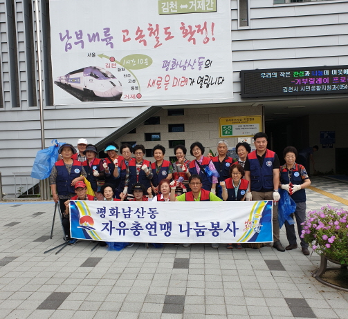 민족의 대명절인 추석을 맞이하여 평화시장과 상가를 찾는 시민들에게 쾌적한 명절 분위기를 제공하고, 김천역을 이용하는 귀성객에게 깨끗한 김천의 이미지를 심어주기 위하여 실시된 이날 봉사활동은 한국자유총연맹 평화남산동분회 회원 30여 명이 참가하였다.