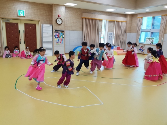 전통의상 한복을 곱게 차려입은 유아들은 제기차기, 투호놀이, 딱지치기, 엉덩이 씨름, 말뚝이 떡 먹이기 등 다양한 전통놀이를 직접 체험하였다.