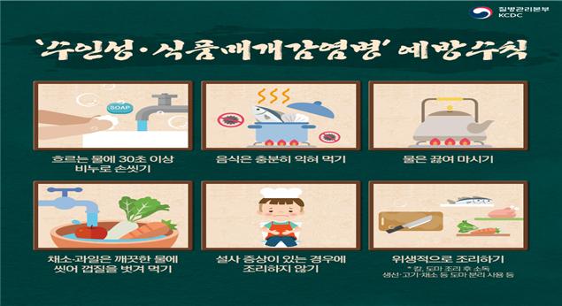 수인성·식품매개감염병은 명절기간 동안 상온에 장시간 노출되어 부패될 수 있는 음식의 공동섭취 등으로 집단발생이 우려되므로 예방을 위하여, 흐르는 물에 30초 이상 비누로 손을 씻고, 안전한 물과 음식을 섭취하여야 한다. 특히 올해는 A형간염 환자가 크게 증가하고 있어, 예방수칙을 보다 철저히 준수하고 가족 중 A형 간염 환자가 발생한 경우 같이 생활하는 가족은 A형간염 예방접종을 받아야 한다.
