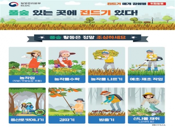 가을철(9~11월)에 발생이 증가하는 쯔쯔가무시증, 중증열성혈소판감소증후군(SFTS) 등 진드기 매개감염병을 예방하기 위해서는 명절 때 많이 하는 성묘, 벌초 등 야외활동 시 피부 노출을 최소화하여 진드기에 물리지 않도록 주의해야 하고, 몸에 붙어 있을 수 있는 진드기 제거를 위해 귀가 즉시 샤워나 목욕을 하여야 한다. 아울러 야외활동 후 고열, 두통, 구토, 설사, 복통, 메스꺼움 등의 의심증상 발생 시 즉시 의료기관을 방문하여 신속한 검사 및 진료를 받을 것을 당부 하였다.