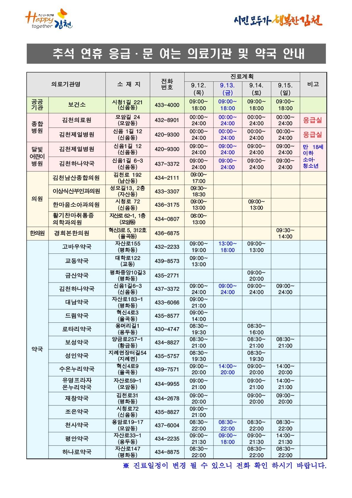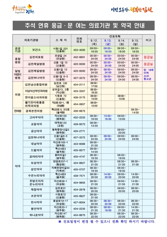 김천시, 추석 연휴 문 여는 의료기관 및 약국 안내