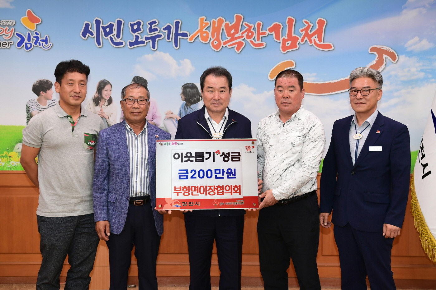 이번 기부는 김천시 승격 70주년을 맞아 범시민운동으로 추진 중에 있는 ‘Happytogether 김천운동’의 일환으로 진행되는 기부릴레이 프로젝트 사업의 뜻에 공감한 부항면 이장들의 자발적인 동참으로 이뤄질 수 있었다.