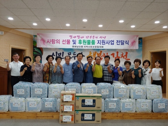 | 평화남산동 지역사회보장협의체(공공위원장:서범석평화남산동장, 민간위원장: 고진석)는 9월10일 평화남산동행정복지센터 3층 강당에서 추석명절 사랑의 이불 및 후원물품 전달식을 가졌다.