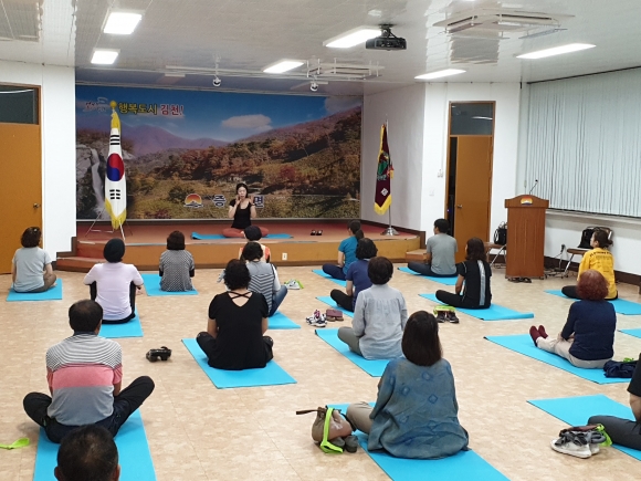 | 김천시 증산면은 9월 17일, 면사무소 2층 회의실에서 김영욱 증산면장, 김용태 주민자치위원장, 강사 및 수강생 40여명이 참여한 가운데 ‘요가강습’의 개강식 및 첫 수업을 가졌다.