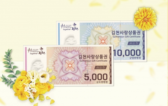 | 지난 8월 1일 30억 규모로 발행된 김천사랑상품권은 시민들의 뜨거운 관심으로 9월 18일 현재까지 약 13억원 이상 판매되었다. 특히 추석명절을 전후하여(9월1일∼18일) 판매된 금액이 약 9억원으로 이는 지난 8월 한달 간 판매된 4억원의 두배에 이른다. 김천사랑상품권은 5천원권, 1만원권 2종으로 구성되어 있으며, NH농협은행, 대구은행, 김천농협(본점), 새김천․대신동․평화동․중앙새마을금고, 김천신협에서 9월 30일까지 10%의 할인을 받아 1인당 월 40만원, 연간 400만원까지 구매 할 수 있으며, 10월부터는 상시 6% 할인이 적용된다.