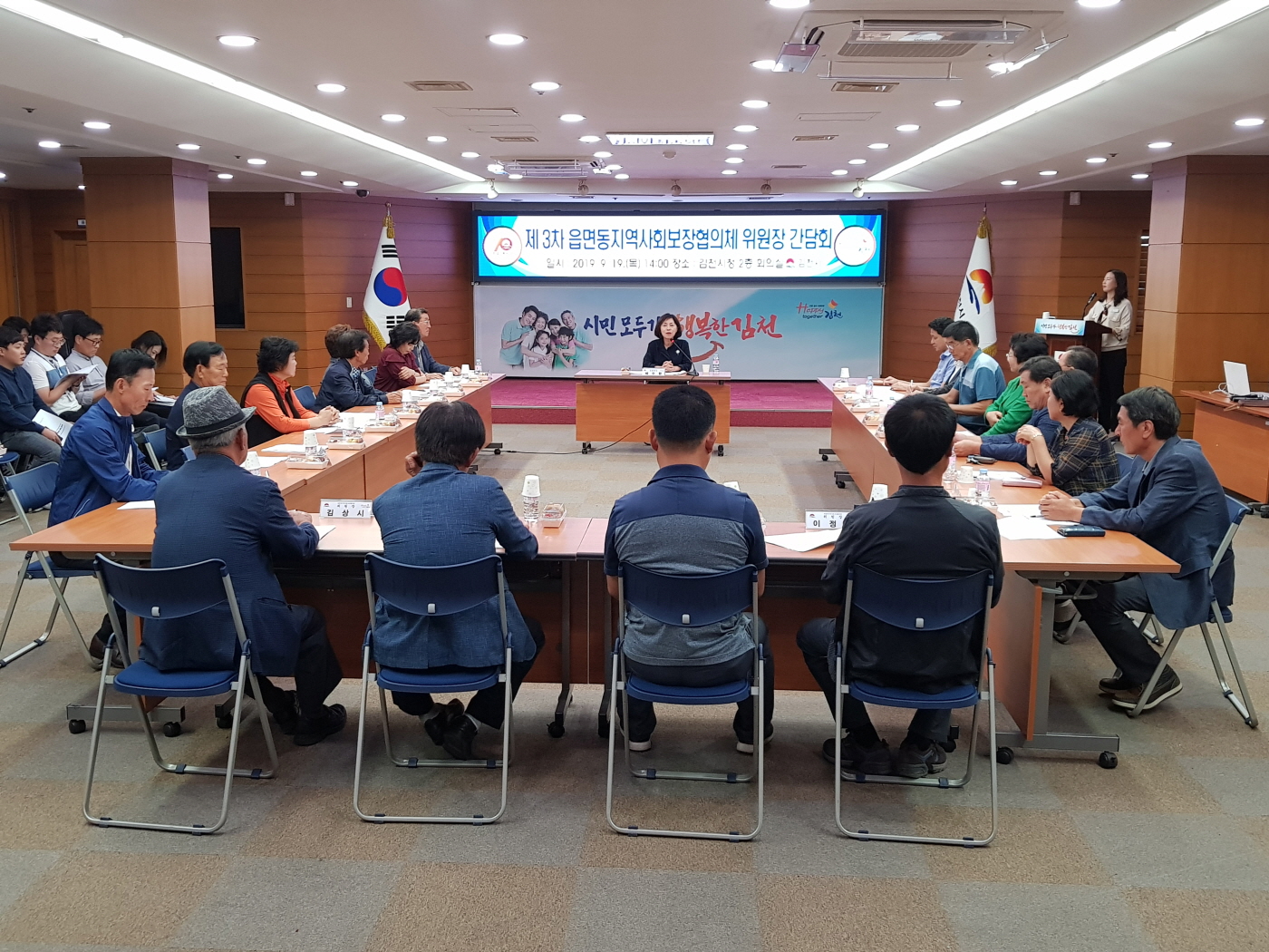 | 김천시지역사회보장협의체(위원장:김충섭, 공동위원장:배수향)는 지난 19일 시청 회의실에서 읍면동지역사회보장협의체 김두호 위원장을 비롯한 각 읍면동지역사회보장협의체 위원장과 담당 공무원 등 40여명이 참석한 가운데 ‘제3차 읍면동지역사회보장협의체 위원장 간담회’를 실시하였다.