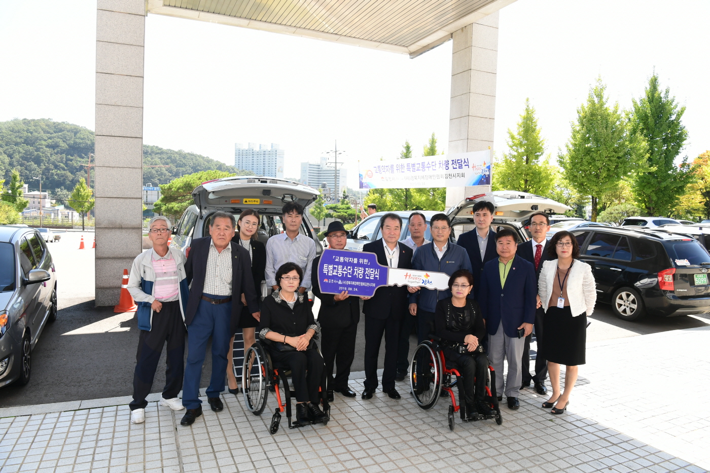 | 김천시는 지난 9월 24일 김충섭 김천시장과 박희만 경북지체장애인협회김천지회장 및 회원, 지역주민 등 30여명이 참석한 가운데 특별교통수단 차량 전달식을 가졌다. 특별교통수단 차량은 지난 2014년도 3대로 출발하여, 2016년에 2대, 2017년에 2대, 올해 2대를 각각 증차하여 총 9대의 특별교통수단을 운영하게 되었으며, 교통약자들을 위해 지난 3년간 32,000여건의 서비스를 제공하였다.