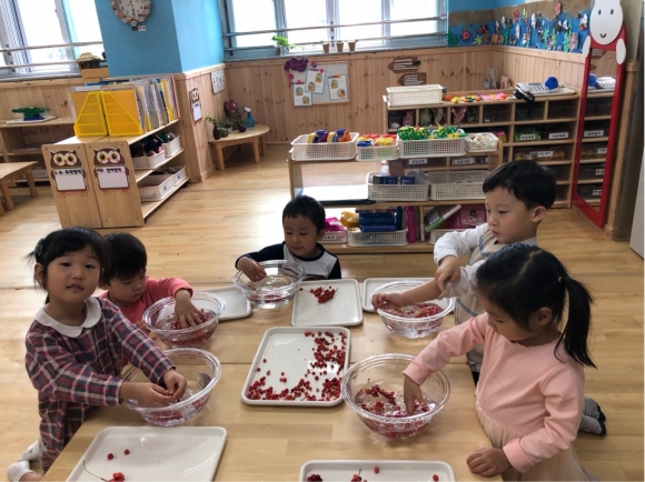 전날인 23일(목)에는 오미자를 관찰하고, 오미자를 깨끗이 씻어서 오미자청을 담그기 위한 준비를 미리 해놓았다. 오미자를 본 유아들은 “빨간 앵두 같아요.”라고 말하였다. 유아들이 직접 오미자를 먹어보면서 신맛, 매운 맛, 짠맛, 쓴맛, 단맛의 5가지 맛을 직접 느껴보도록 하였다.