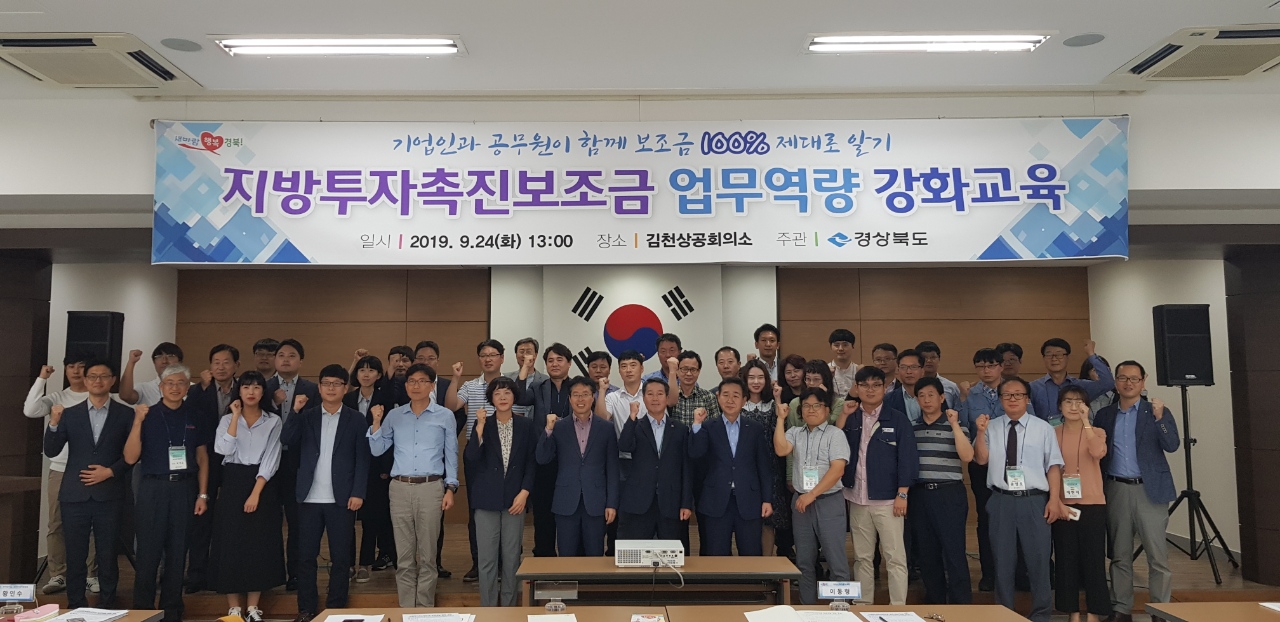 | 산업통상자원부와 경상북도에서 주최하는 경상북도 지방투자촉진보조금 업무역량 강화 교육이 9월 25일 13시, 김천 상공회의소 4층 대회의실에서 개최되었다.
