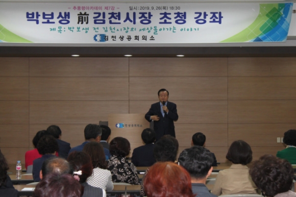 | 김천상공회의소(회장 김정호)는 지난 9월 26일 본 회의소 4층 대회의실에서 박보생 전 김천시장을 초빙해 ‘박보생 전 김천시장의 세상돌아가는 이야기’라는 주제로 「추풍령 아카데미」 일곱 번째 과정을 열었다.
