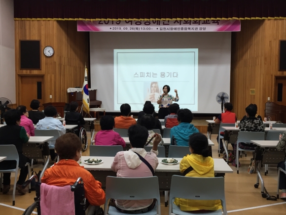 | (사)경북지체장애인여성자립 김천시지원센터(센터장 박희만)는 9월 26일 목요일 오후 1시 김천시장애인종합복지관 3층 강당에서 지회 여성장애인 및 임직원 등 40여명이 참석한 가운데 여성장애인 사회화교육을 실시하였다. 이번 사회화교육은 행복한강사연합회 대표 박미애 강사의 “스피치는 용기다”라는 주제로 즉석 스피치의 테크닉 비법 및 품격 있는 유머, 위트화법에 대한 강의를 강의하였다. 스피치의 가장 기본은 자신감으로 여성장애인들이 직접 무대로 나와 발표를 하는 등 직접적은 체험을 통한 교육으로 참여자들로 하여금 자존감 및 자신감을 높이게 하는 계기를 마련하였다.