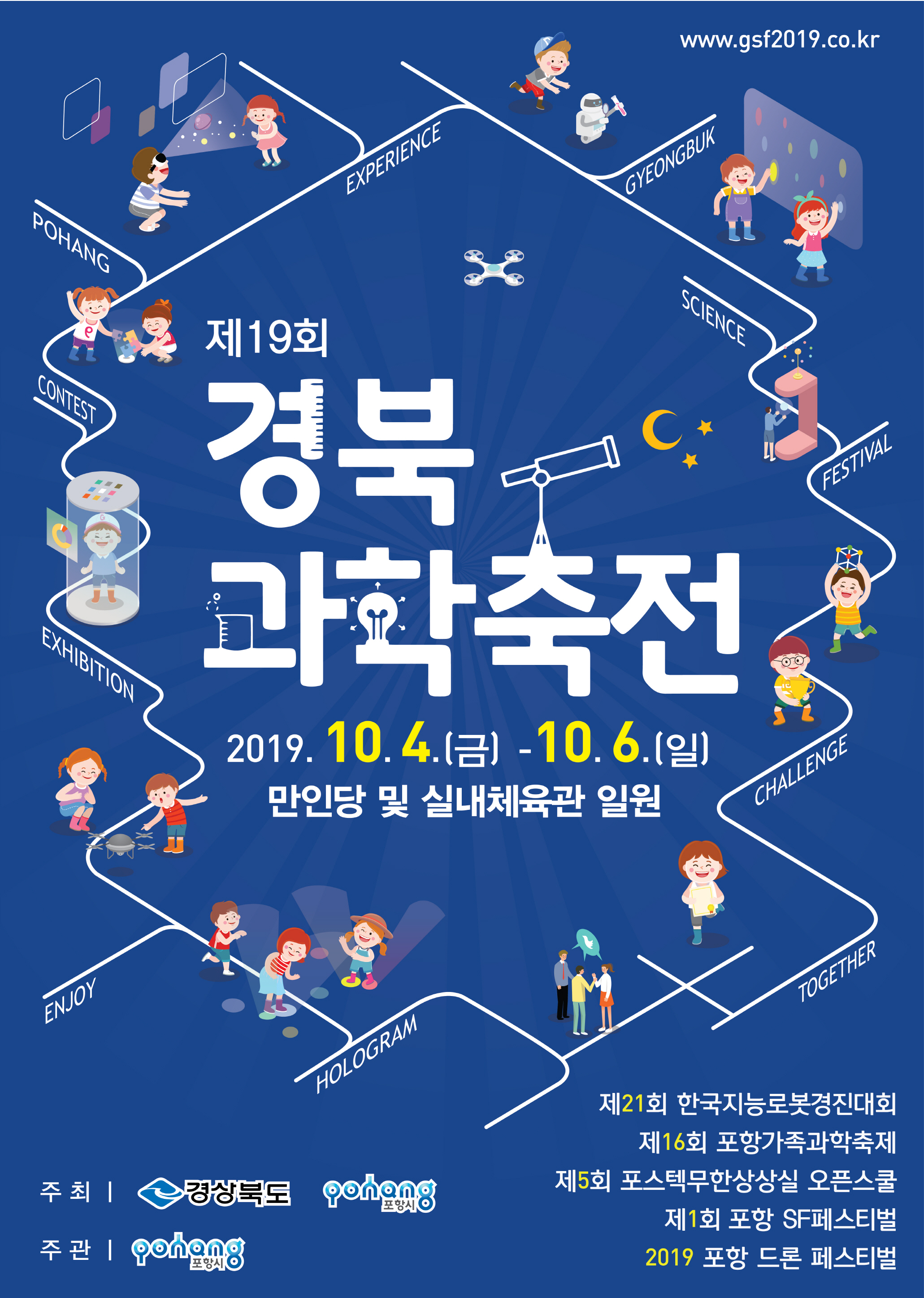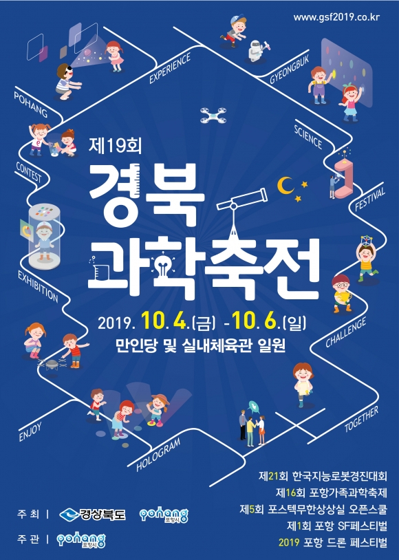 | 경상북도는 경북의 첨단과학기술을 한눈에 보고, 느끼고 체험할 수 있는‘제19회 경북과학축전’을 10월 4일 ~ 6일까지 3일간 포항 만인당 및 실내체육관 일원에서 개최한다.