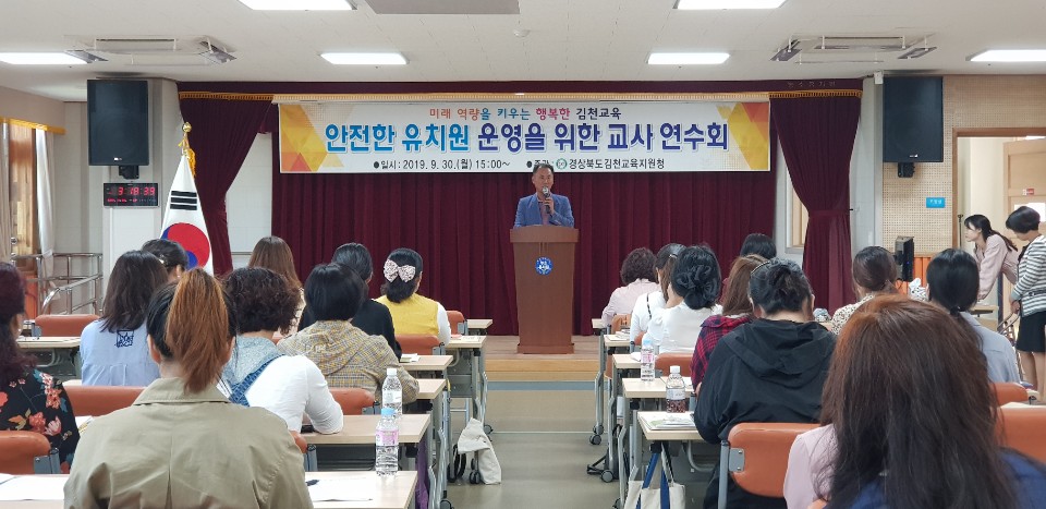 | 경상북도김천교육지원청(교육장 마숙자)은 9월30일(월)에 공․사립 유치원 교원 40명을 대상으로 농소유치원 강당에서 ‘2019 안전한 유치원 운영을 위한 교사 연수’를 실시하였다. 이번 연수는 농소유치원 차새봄 선생님의‘열두달 걱정NO! 행복 up 농소안전유치원’라는 사례를 시작으로 학부모가 안심하고 맡길 수 있는 안전한 유치원 운영 방안에 대한 방향 제시와 충분한 논의가 이루어 졌다.