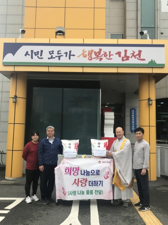 | 김천시 연호사(주지 도우스님)는 지난 1일 대곡동행정복지센터를 방문하여 관내 소외되고 생활이 어려운 이웃들에게 전달해 달라며 백미 20kg 7포를 기탁했다.