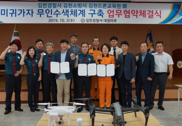 | 김천경찰서(서장 임경우)는, 김천소방서-김천드론교육원과 함께 10월 2일 경찰서 4층 대청마루에서 각 기관 관계자들이 참석한 가운데 치매노인·아동·장애인 등 미귀가자 무인수색체계 구축을 위한 업무협약을 체결하였다.