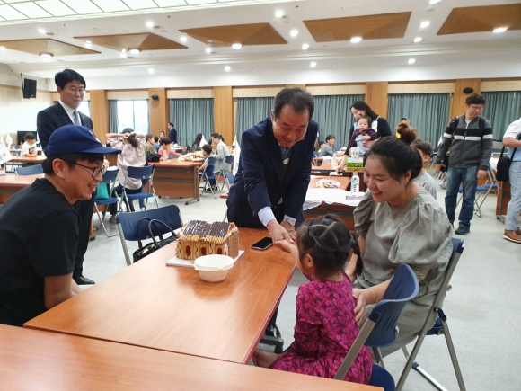 | 또한, 시청 내 강당에서는 오전, 오후로 나뉘어 총 50가족이 참가해 과자로 미래에 살고 싶은 꿈이 담긴 집을 직접 만들어 보는 어린이 과자 집짓기 체험행사가 열려 아이와 함께 참가한 가족들에게 큰 호응을 얻었다.