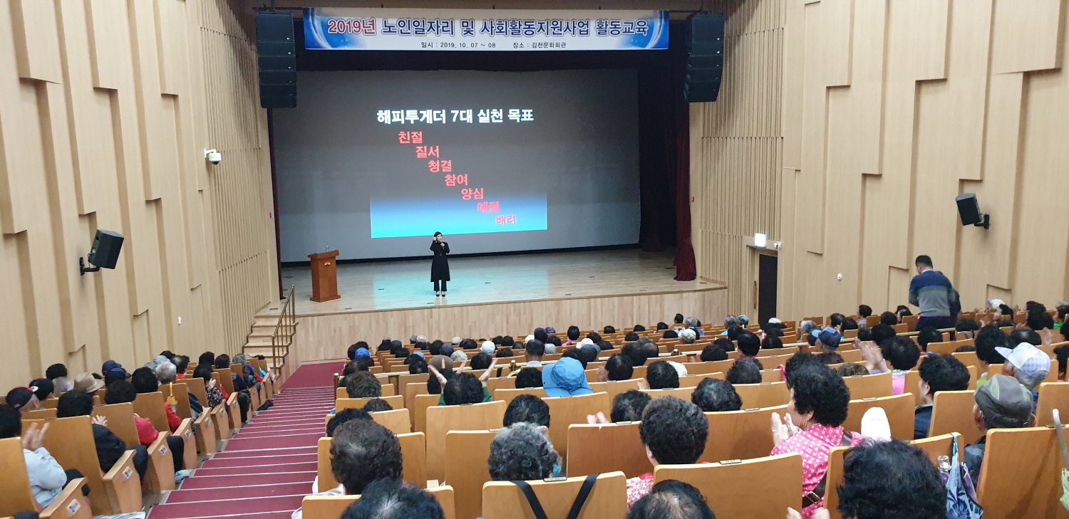 | 김천시(시장 김충섭)는 시 승격 70주년을 맞아 김천의 새로운 미래, 100년을 준비하고, 올바른 시민의식 함양을 위해 Happy Together 김천운동을 대대적으로 전개하며 새로운 변화를 이끌어 가고 있으며, 가시적인 성과가 곳곳에서 나타나고 있다. 이에 김천시 주최로 지난 10월 7일 ~ 8일 총 4회에 거쳐 노인일자리사업 참여 어르신 1,200여명을 대상으로 김천문화회관 대강당에서 Happy Together 김천운동 교육을 실시하였다.