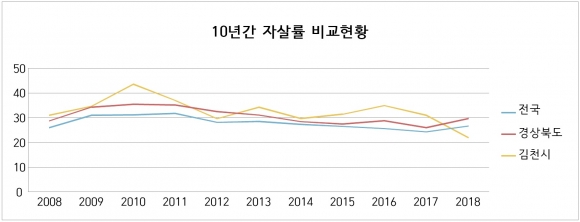 | 경북 김천시의 자살률이 22.0명으로 집계되었다. 통계청이 발표한 지난해 자살률을 보면 전국과 경상북도의 자살률이 작년보다 증가(▲ 전국2.3명, ▲경북3.0명) 하였음에도 불구하고 김천시는 눈에 띄는 감소율(▼ 9명)을 보였다