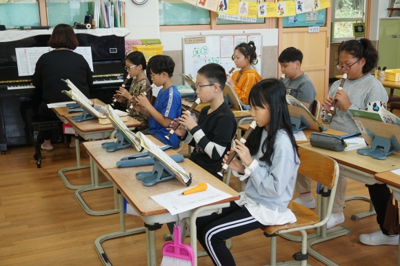5학년 임초연 교사가 음악과 수업 3. 즐겁게 신나게 6)나무노래단원을 중심으로 빠르기의 변화를 살려 리코더 연주하기라는 학습주제를 가지고 위량초 5학년 학생들과 함께 신나고 즐거운 수업을 하였다. 지난 시간에 배웠던 ‘나무의 노래’를 부르며 곡의 특징을 확인하기로 도입하여 빠르기 말 익히기, 빠르기말 메모리 게임, 빠르기의 변화를 살려 리코더 연주하기 등의 학습활동을 전개하면서 학생들과 함께 호흡하는 수업을 진행하였다.