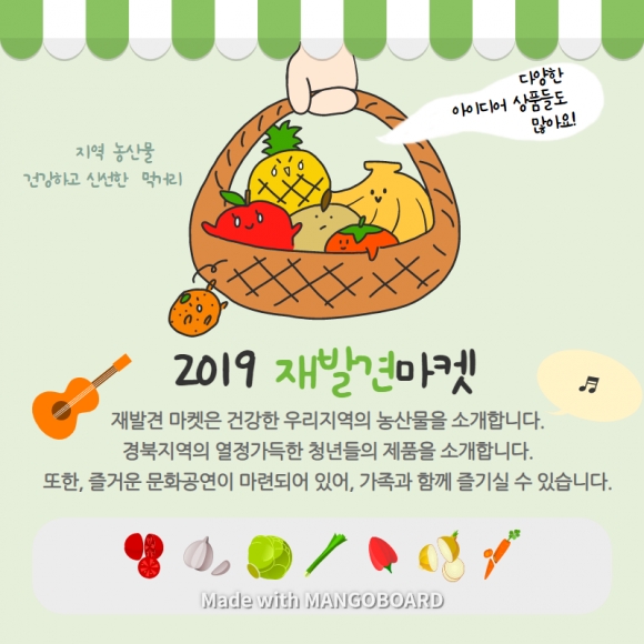 한편 지역에서 문화공동체 ‘호두와 나무’로 다양한 문화나눔과 공연활동을 이어가고 있는 우현덕 대표는 김천지역의 자산과 일상을 재발견할 수 있는 이번 ‘재발견 마켓’을 통해 지역의 우수한 상품을 알리고, 주민들과 함께 나누는 문화 콘텐츠를 꾸준히 개발해나가겠다고 전했다.