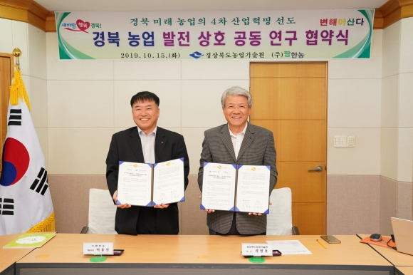 | 경상북도농업기술원은 15일 농업기술원 회의실에서 주식회사 팜한농(대표 이유진)과 ‘센서와 빅데이터를 활용한 병해충 예찰 및 최적 방제 솔루션’ 기술 개발과 상용화를 위해 공동연구 협약(MOU)을 체결했다.