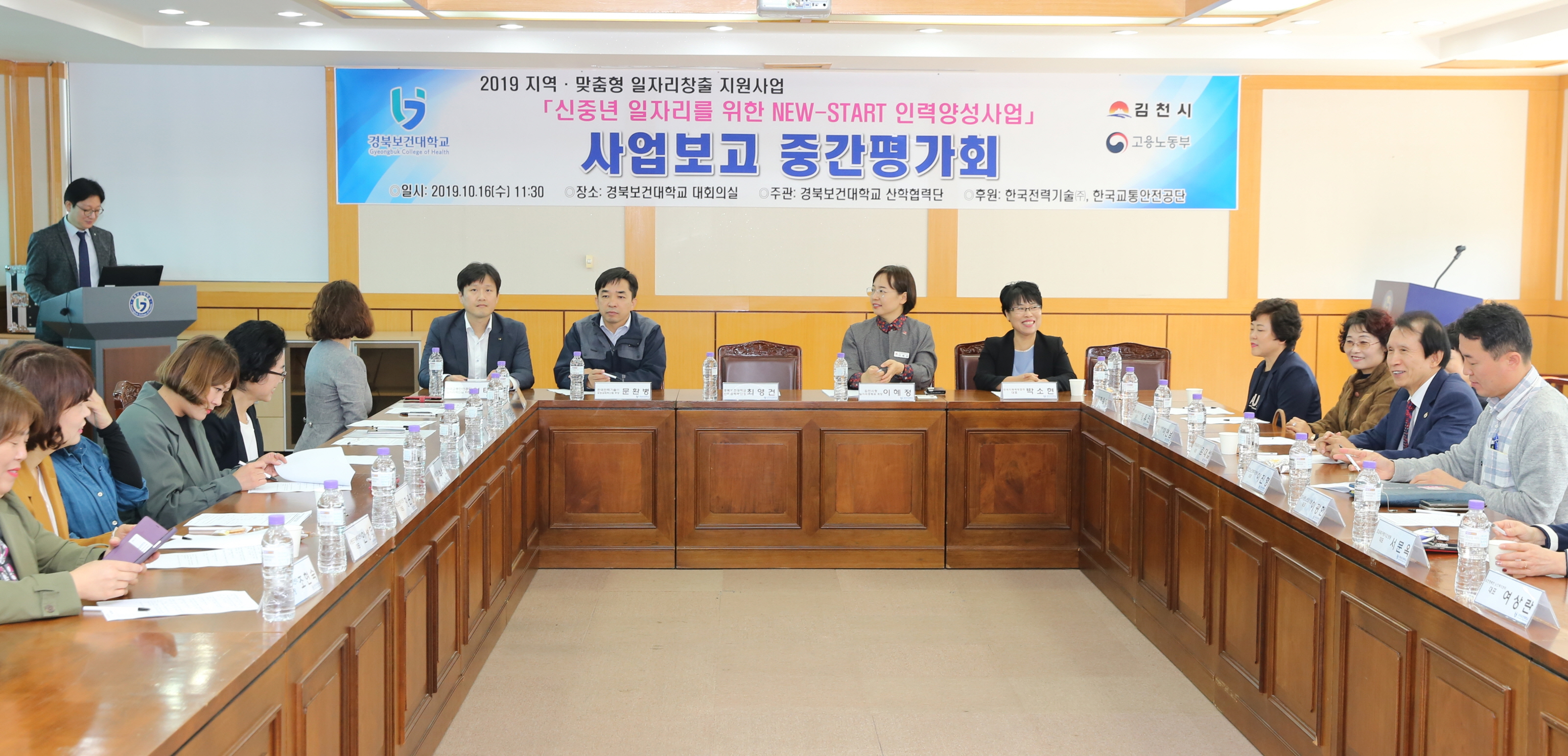 | 김천시와 경북보건대학교(총장 이은직) 산학협력단은 고용노동부가 주관하고 한국전력기술(주)과 한국교통안전공단이 후원하는 ‘2019 신중년 일자리를 위한 NEW-START 인력양성사업’ 사업 중간평가 보고회를 16일(수)에 대학본부 2층 대회의실에서 개최했다.