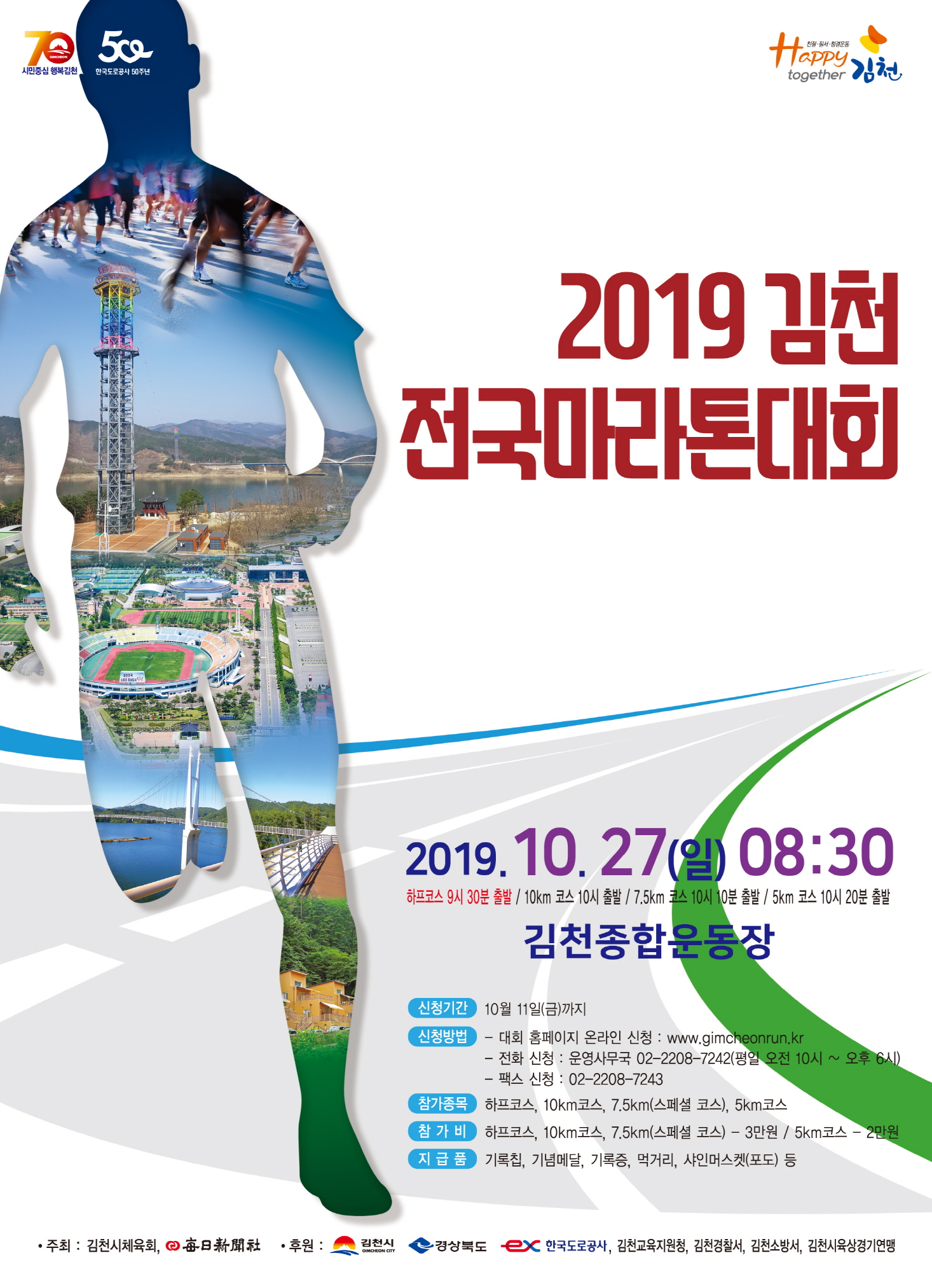 | 김천시(시장 김충섭)는 오는 27일 시 승격 70주년&한국도로공사 창립 50주년을 기념하는 『2019 김천전국마라톤대회』를 김천종합운동장에서 개최한다.