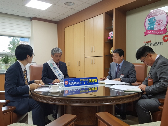이지회장은 인사말을 통해“병원비 걱정 없는 나라를 만들기 위해 65세 이상 어르신 임플란트와 틀니 보험급여확대, 선택진료비 및 종합병원급 이상 상급병실료 폐지, 초음파 및 MRI 검사 급여확대, 간호·간병 통합서비스 확대, 금연치료 건강보험 지원사업 실시, 노인장기요양보험제도에서는 치매국가책임제 추진 성공적 이행에 대한 공단의 노력에 감사드린다. 세계적으로 우수한 건강보험제도를 바탕으로 건강보험이 국민의 건강과 사회보장 증진을 위해 다양한 업무를 하고 있음을 재확인 했다. 건강보험 업무에 대해 더 많이 알 수 있는 계기가 될 것 같다. 공단과 함께 지역주민의 건강증진을 위해 최선을 다할 것”이라고 소감을 밝혔다.