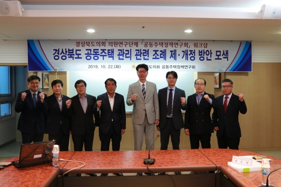 | 경상북도의회 의원연구단체「공동주택정책연구회」(대표 김준열의원)는 10월 22일(화) 구미시 일원에서 ‘경상북도 공동주택관리 관련조례 제·개정방안 모색’을 위한 워크숍을 개최했다.