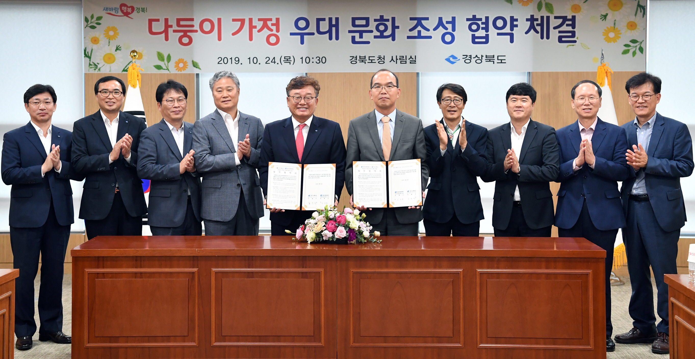 | 경상북도는 24일 도청 회의실에서 (재)대구은행장학문화재단(이사장 김태오)과 ‘경상북도 다둥이가정 우대 문화조성’을 위한 업무협약을 체결했다.