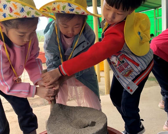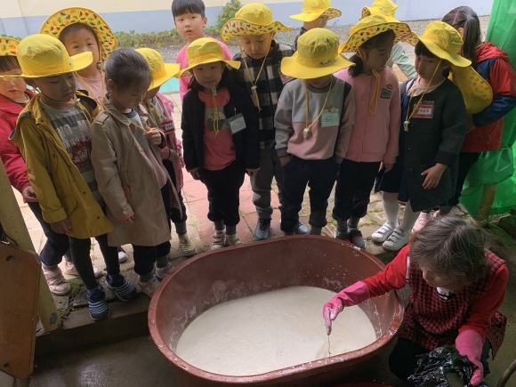 콩이 만들어지는 과정에 대해서 이야기 나누면서, 딱딱했던 콩이 부드러운 두부가 되는 것에 유아들이 흥미를 가졌다. 이야기를 나눈 후, 유아들이 직접 두부를 만들기 위해서 맷돌에 콩을 넣고 갈아보고, 간수를 넣어서 순두부의 모습을 보았다. 송모 어린이는 “간수가 들어가니깐, 콩물이 몽글몽글한 순두부가 되어서 신기해요.”라고 말하였다. 또한, 유아들은 만든 두부를 직접 맛을 보면서 두부의 맛을 표현해보았다.