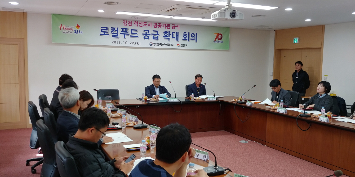 | 김천시(시장 김충섭)는 29일 김천시농업기술센터 2층 세미나실에서 농림축산식품부, 경북도청, 김천시청, 김천 혁신도시 공공기관, 한국농수산물유통공사 등 20여명의 관계자가 참석한 가운데 김천 혁신도시 공공기관 급식에 김천시 농산물을 우선적으로 공급할 수 있는 방안을 논의하기 위하여 회의를 개최하였다.