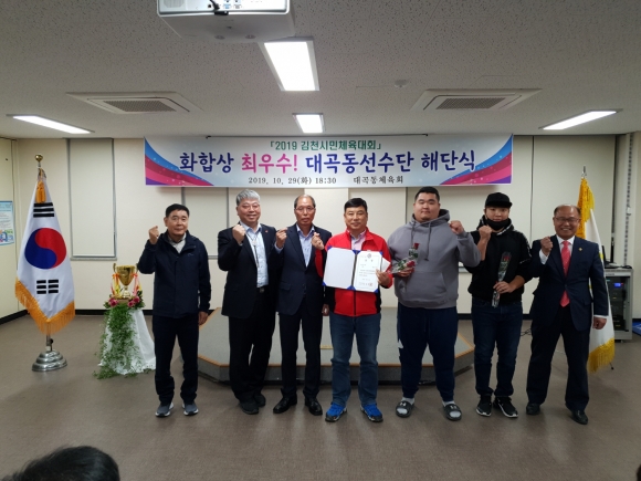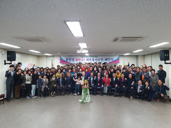 | 대곡동체육회(회장 정문호)는 지난 29일 2019 김천시민체육대회 화합상 최우수를 자축하며, 지난 2달 동안 고생한 선수들과 함께 해단식을 동행정복지센터 3층 강당에서 개최했다.