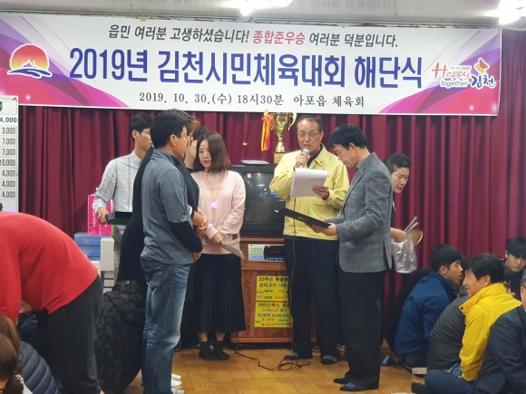 | 아포읍 체육회(회장 유청술)는 지난 30일 시민체육대회 해단식을 끝으로 2019년 김천시민체육대회 일정을 마무리 하였고 이번 시민체육대회에서 종합준우승을 차지하여 또 한번 저력을 과시하였다.