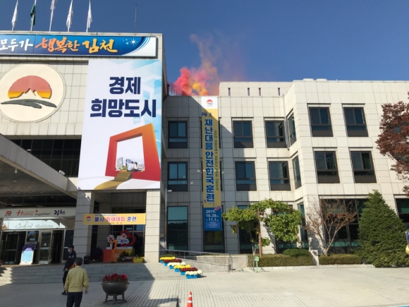 청사내 화재대피 안내방송에 이어 화재 경보기가 작동되자 사무실에서 근무하던 직원과 민원인들이 신속하게 청사밖 주차장으로 대피하였으며, 김천시청 자위소방대 소화팀에서는 초기 화재진화를 위해 건물내 소화전을 신속하게 작동하여 119소방서 펌프차와 구급차량이 도착할 때까지 화재진압을 실시했다.
