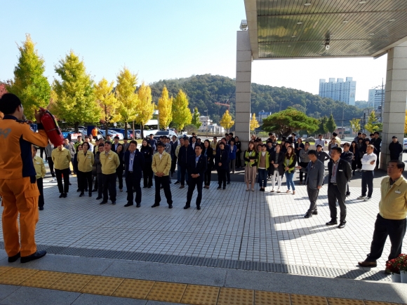 | 김천시(시장 김충섭)는 10월 31일 김천시청 본관 건물에서 공무원과 민원인 200여명이 참여한 가운데 대광 119안전센터 협조로 불시 화재 대피훈련을 실시했다.