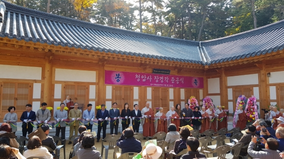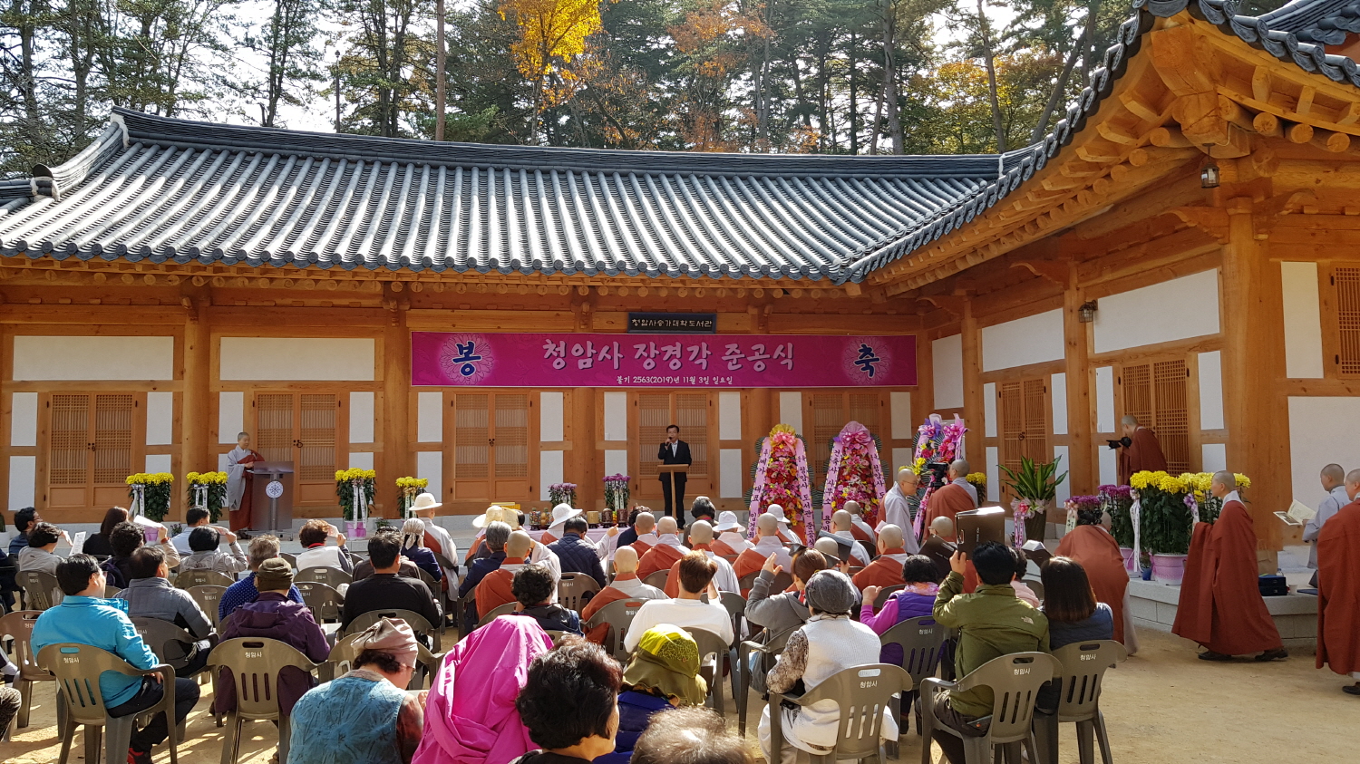 한편, 이강창 김천 부시장은 “청암사 스님들과 많은 신도님들을 모시고 장경각 준공식을 갖게 된 것을 매우 뜻깊게 생각하며, 오랜 세월을 간직해 온 천년고찰 청암사를 잘 가꾸고 보존할 뿐만 아니라, 소중한 문화유산을 유지 전승하는데 더욱 힘써 주실 것”을 당부하였다.