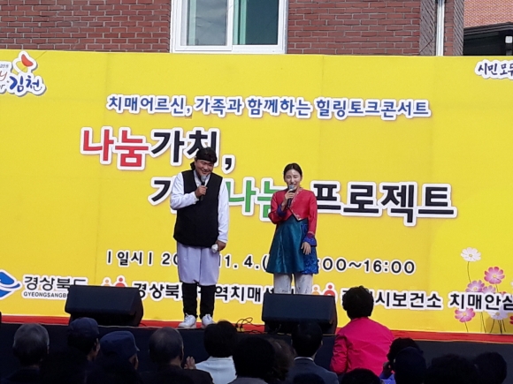 이날 행사에는 녹야유치원생들의 고사리 같은 손으로 흥겨운 시간을 만든 사물놀이와 대한노인회 김천시지회 행복나눔 봉사팀의 난타공연을 시작으로 경상북도 치매홍보대사인 ‘기웅아재와 단비’의 진행으로 힐링콘서트를 진행하였으며, 치매 가족들과 함께하는 담소회를 통해 ‘치매’ 라는 아픔을 환자 가족들이 서로 소통하고 공감대를 형성하는 뜻깊은 자리를 가졌다.
