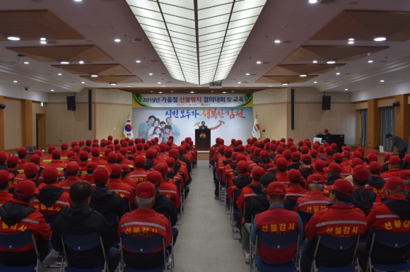 | 김천시는 11월 11일 산불감시원, 산불예방전문진화대, 공무원 등 200여명이 참석한 가운데 산불방지 활동에 총력을 다할 것을 다짐하는 ‘2019년 가을철 산불방지 결의대회 및 교육’을 김천시청 대강당에서 개최하고 본격적인 산불방지 비상체제로 돌입했다.