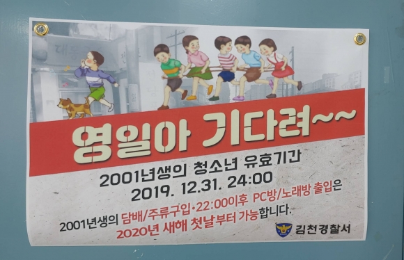 올해 수능에 응시하는 고등학교 3학년인 2001년생(청소년 보호법상 기준연령)은 담배·주류 구매가 2020년부터 가능함을 알리고자 ”영일아 기다려“ 라는 문구로 홍보물을 제작, 청소년들이 주로 이용하는 편의점, PC방, 일반음식점 등에 부착하여 홍보에 나서고 있다.