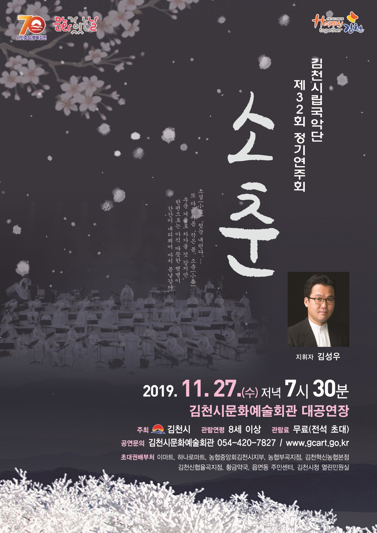 | 김천시문화예술회관(관장 김금숙)에서는 11일 27일(수) 오후7시 30분 김천시문화예술회관 대공연장에서 김천시립국악단 제32회 정기연주회 “소춘(小春)”을 개최한다. 이번 김천시립국악단 정기연주회는 음력 시월(十月)을 일컫는 “소춘”이라는 주제를 통해, 추운 겨울이지만 작은 봄날의 향취를 느낄 수 있는 공연을 기획하여 시민들에게 얼어붙은 몸과 마음을 녹일 수 있는 기회를 선사하고자 하였다.