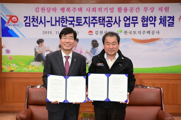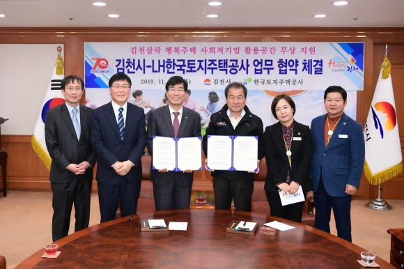| 김천시(시장 김충섭)는 지난 14일 LH한국토지주택공사(이하 한국토지주택공사)와 김천삼락 행복주택 사회적기업공간 입주를 위한 협약을 체결하였다. 이날 협약식에는 김충섭 김천시장, 한국토지주택공사 대구경북지역본부 김정진 본부장 외 11명이 참석하였다. 이번 협약은 경상북도 내에는 최초로 시행되는 사업으로 한국토지주택공사에서 「공공주택 업무처리지침」에 의거 사회적기업의 공익목적기관의 자립, 조기안정화 성장을 지원하고자 장기공공 임대주택 내에 사회서비스 또는 일자리 제공이 가능한 사회적기업이 입주할 수 있도록 127㎡의 점포를 20년간 무상으로 제공하게 된다.