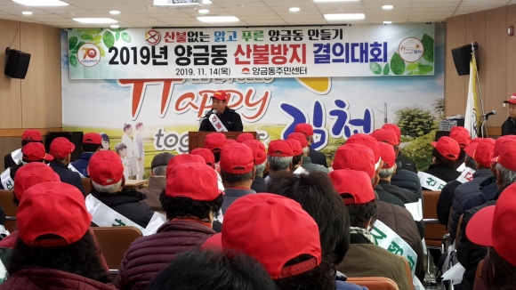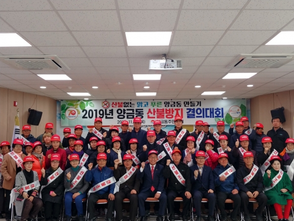 | 양금동주민센터(동장 이우원)에서는 본격적인 산불예방 기간을 맞아 11월 14일 통장, 기관·단체장, 새마을 지도자·부녀회장 등 100여명이 참석한 가운데 2019년 산불방지 결의대회를 개최 하였다.