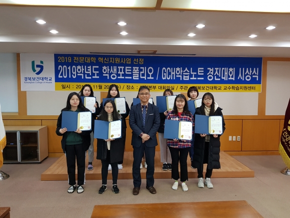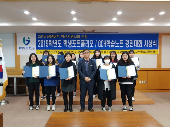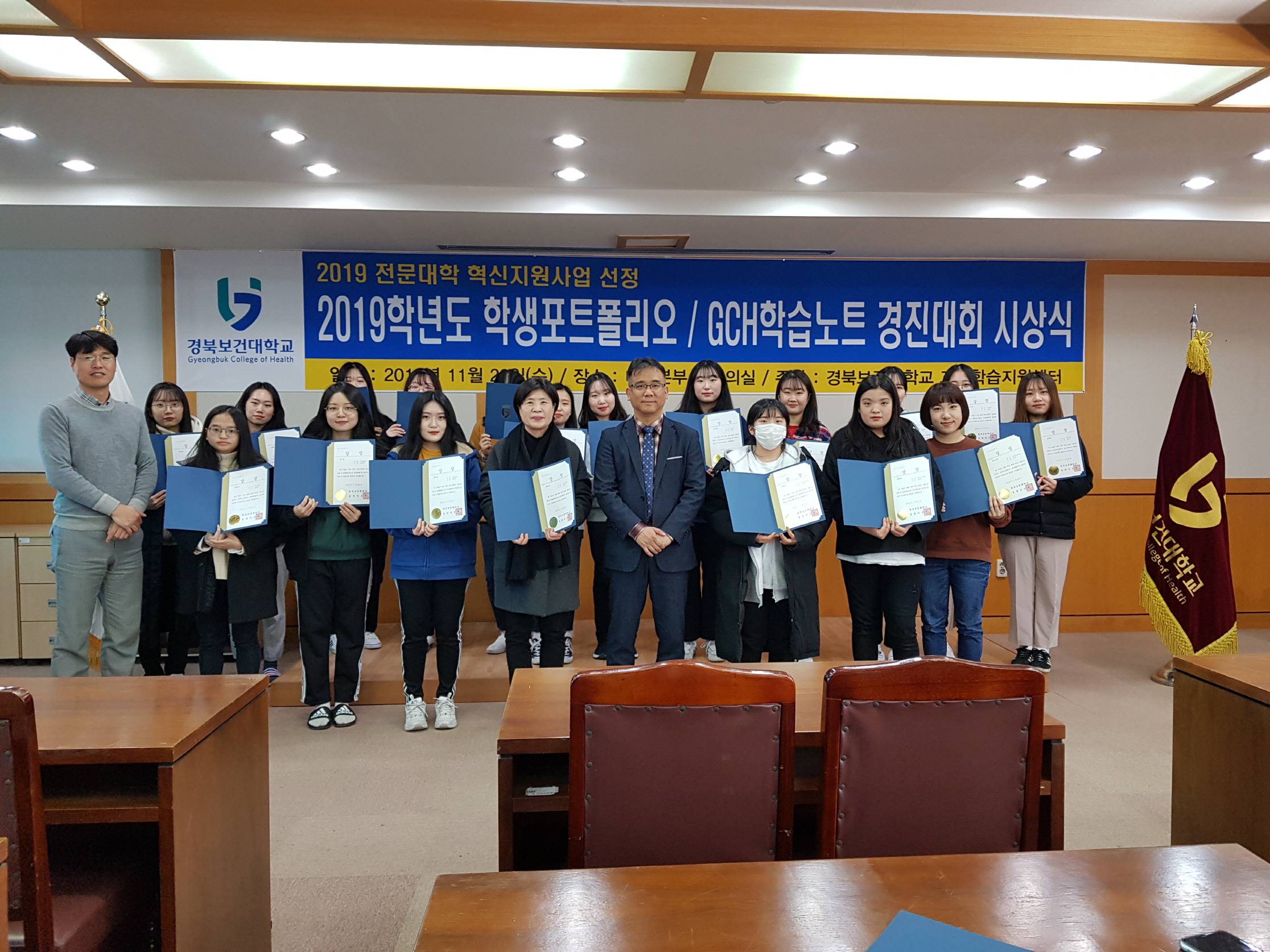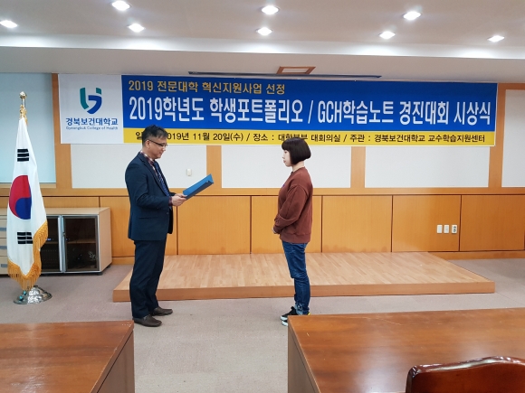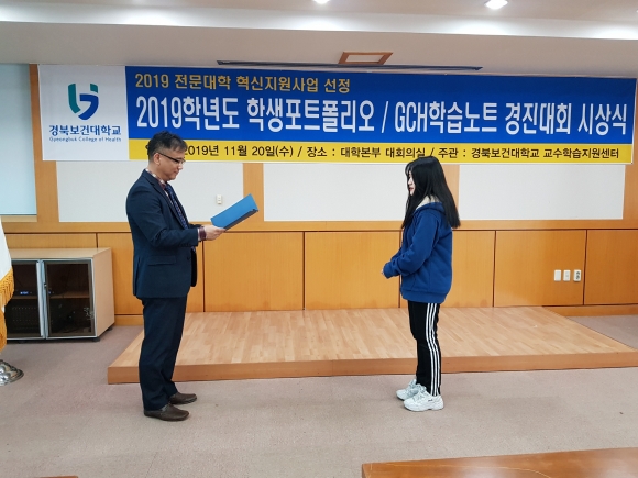 | 경북보건대학교(총장 이은직) 교육혁신원 교수학습지원센터는 11월 20일(수) 대학본부 2층 회의실에서 2019학년도 학생포트폴리오 & GCH학습노트 경진대회 시상식을 가졌다.
