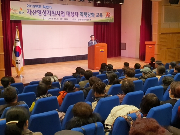 | 김천시(시장 김충섭)는 지난 11월 21일 김천시문화예술회관소공연장에서 희망·내일키움통장 가입자 160여명이 참석한 가운데 "합리적 소비생활"과“Happy together”라는 제목으로「자산형성지원사업 대상자 역량강화 교육」을 실시하였다. 희망·내일키움통장은 자산형성지원제도의 일환으로 일하는 저소득계층이 목돈을 마련할 수 있도록 자립자금을 지원하여 탈빈곤을 촉진하는 제도로 3년이내 탈수급을 조건으로 하고 있다. 이는, 3년 만기 시 본인의 저축액과 근로장려금을 지원하는 방식으로 일하는 사람이 더 대우받고 더 많은 혜택을 받을 수 있는 제도로, 연2회 이상 자립역량강화 교육 참여를 의무화 하여 꾸준한 자기개발과 자기관리로 성공적인 자립을 이룰 수 있도록 도움을 주고 있다.