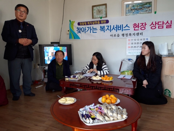 | 아포읍 맞춤형복지팀은 평소 복지서비스에 대해 궁금한 사항이나 문의가 있어도 이동이 불편하여 행정기관을 잘 찾지 못하는 취약한 주민들을 위하여 각 마을 경로당이나 마을회관에 현장 상담실을 마련하였다.