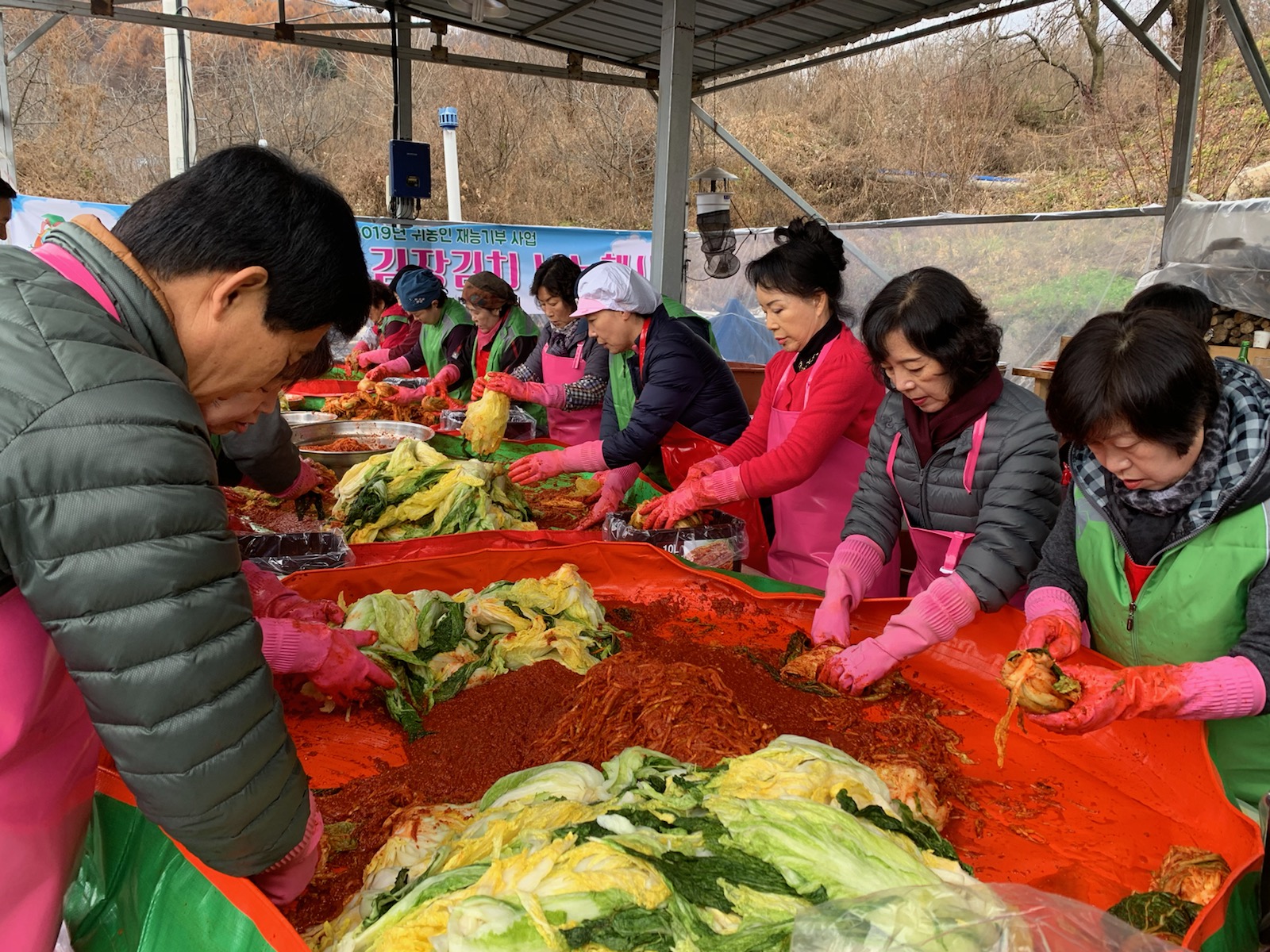 쌀쌀한 날씨 속에서 이른 아침 시작된 봉사활동에는 김천시장님을 대신해 박경자 여사님과 김천시귀농연합회 회원 80여명이 참석했다. 이 날 각 1개 읍과 14개 면의 차상위계층 350가구들을 위해 따뜻한 겨울을 날 수 있도록 약 800포기의 김치를 담갔다.