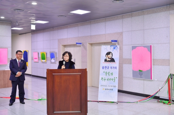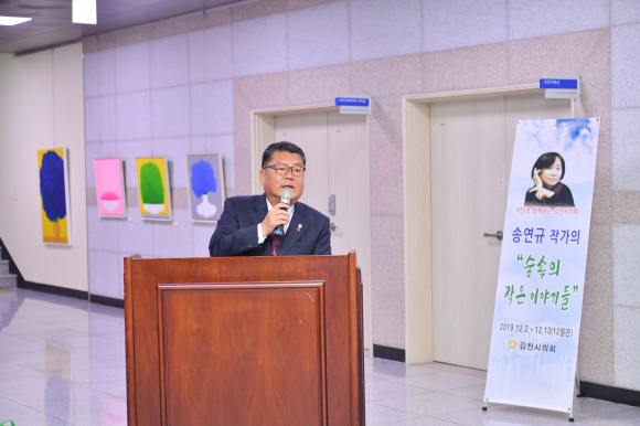 | 김세운 의장은 인사말을 통해 “이번 제208회 제2차 정례회 기간중에 미술작품 전시회를 하겠다고 흔쾌히 작품을 내어주신 송연규 작가와 오픈식에 참석해주신 내빈 여러분께 감사의 말씀을 드린다. 의회가 시민들에게 문턱을 낮추어 더 가깝게 다가가고 친숙해 지기 위해 송연규 작가의 미술작품을 소재로 전시회를 마련하였다. 많은 분들이 작품 관람을 통해 올 한 해동안 받은 스트레스를 문화적으로 힐링할 수 있는 기회가 되기를 바란다.”고 전했다.