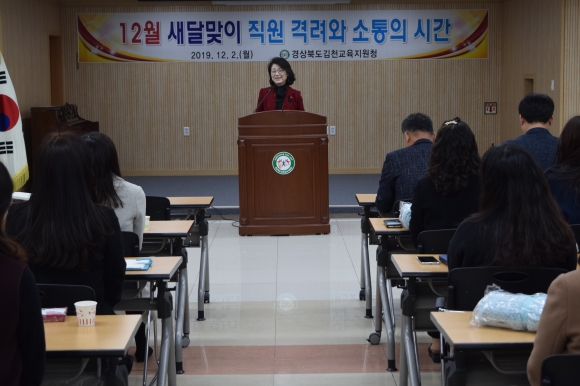 | 경상북도김천교육지원청(교육장 마숙자)은 지난 12월 2일 김천교육지원청 대회의실에서 12월 새달맞이 회의를 개최하였다. 올 한 해 김천교육지원청의 활동을 정리하고 직원들을 격려하는 소통의 시간을 가졌다.
