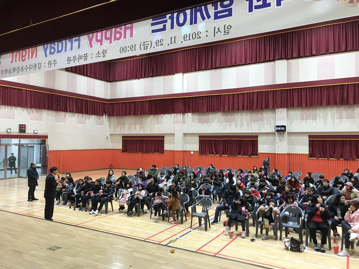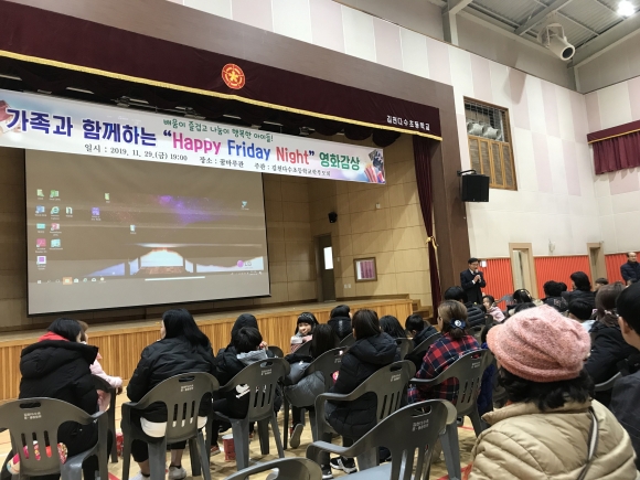 | 김천다수초등학교(교장 김한수)는 11월 29일(금) 저녁 7시에서 9시 30분 까지 ‘가족과함께 하는 해피 프라이데이 나이트 영화 감상을 실시하였다. 가을 끝무렵의 정취와 함께 가족의 오붓함을 즐기려고 학부모(55명)와 아동(56명, 미취학생 포함) 총 50가족이 학교 강당에 모였다.